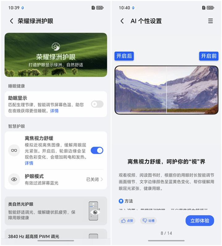 当然,不可否认的是,LCD屏虽然没OLED屏好看,但是更护眼。不过,荣耀的绿洲护眼屏也做了好久了,现在以荣耀为代表的护眼屏幕,护眼的效果其实已经可以媲美LCD屏了,荣耀是通过3840Hz PWM调光来实现的护眼,之前荣耀100Pro第一个用的,市场上用户反馈,特别好,从那以后,荣耀就把这个屏幕叫做了绿洲护眼屏。